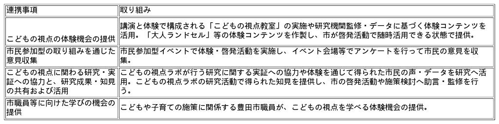 本協定は、こどもの視点ラボと豊田市が相互に連携・協力し、こどもの視点の体験機会を広く市民等に提供するとともに、市民参加型のイベント等を通じて得られる意見を、こどもの視点に関わる取り組みや研究活動へつなげていくことで、こどもを取り巻く環境の質的向上を図り、こどもにやさしいまちづくりの推進を目的としています。両者は本協定に基づき、「こどもの視点教室」や「大人ランドセル」などの体験型施策、市民参加型イベントを通じた意見の収集、「こどもの視点ラボ」の研究活動で得られた知見の活用など、次の連携事項に取り組みます。