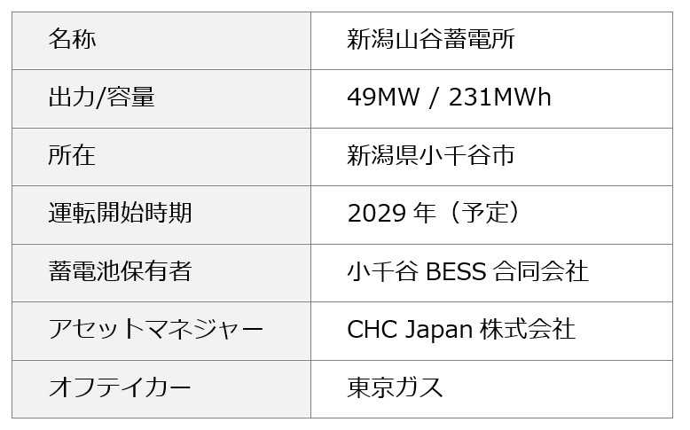 本プロジェクトボンドの対象は、新潟県小千谷市に建設する出力49MWの系統用蓄電所で、2029年の完工を予定しています。商業運転開始後は、東京ガス株式会社(以下「東京ガス」)がオフテイク契約(※3)に基づき20年間にわたり本発電所を運用する予定です。