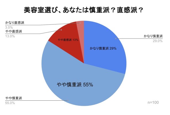 「美容室選び、あなたは慎重派?直感派?」の質問では、『かなり慎重派』が29%、『やや慎重派』が55%、『やや直感派』が13%、『かなり直感派』が3%という結果となりました。