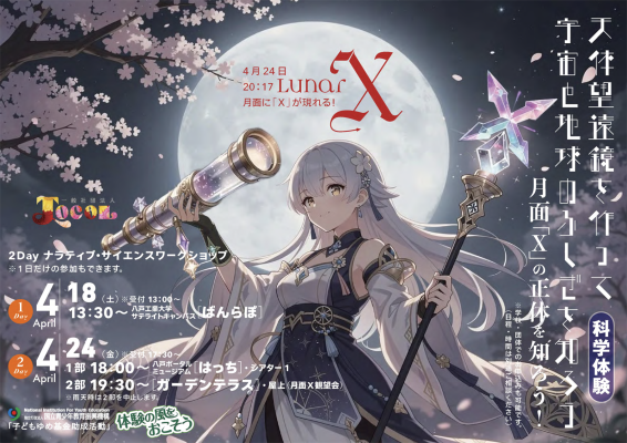 一般社団法人TOCOLは、子どもゆめ基金(独立行政法人国立青少年教育振興機構)の助成を受け、子ども向け体験型ワークショップ「天体望遠鏡を作って月面Xを観察しよう」を開催いたします。(4月17日)